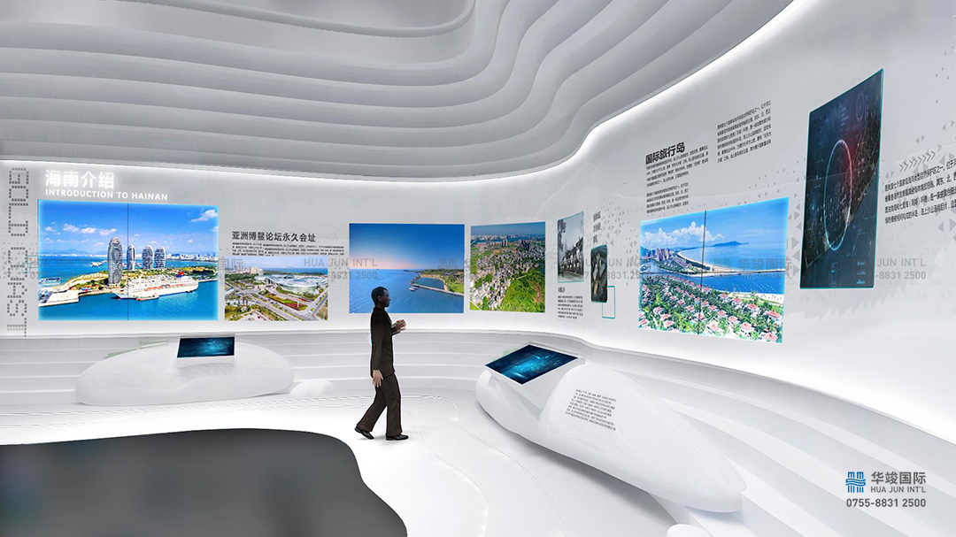 此區(qū)域呈現(xiàn)海南自由貿(mào)易港、生態(tài)、區(qū)位優(yōu)勢、園區(qū)總規(guī)、5G技術(shù)的應(yīng)用,華竣利用前沿光電技術(shù),結(jié)合空間結(jié)構(gòu)打造多媒體互動藝術(shù)裝置,空間上連接一樓和二樓,在時間上連接現(xiàn)在與未來,讓觀眾可通過紅外感應(yīng)或觸碰桌面了解相關(guān)信息。