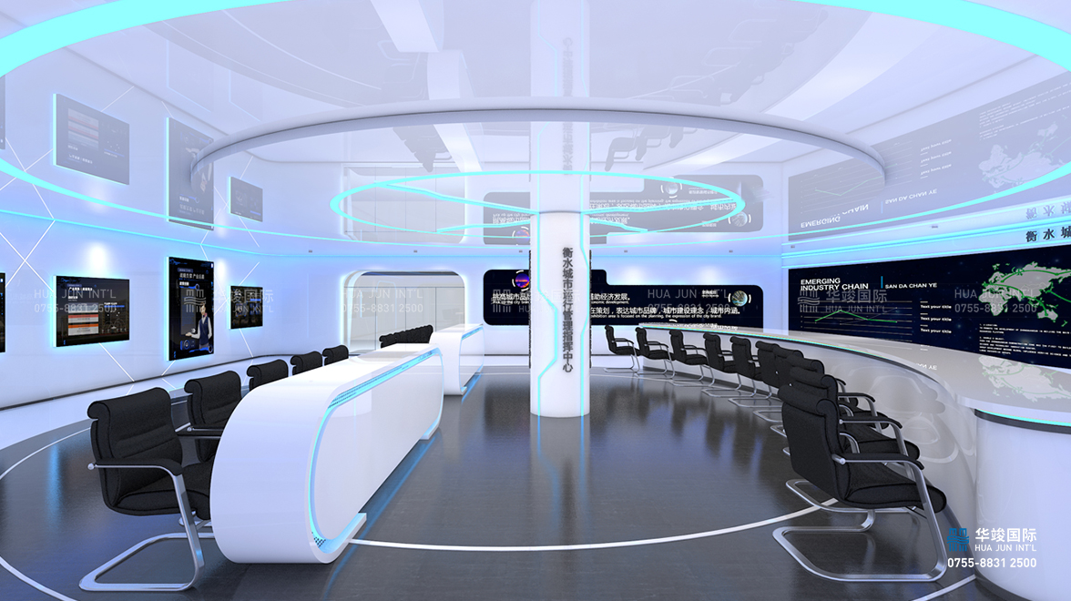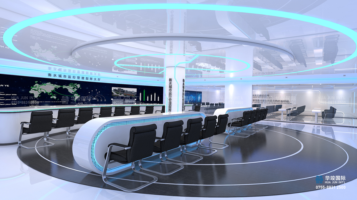 衡水智慧城市運行管理中心展廳主要由入口形象區、指揮大廳、大會議室構成,旨在打造促進衡水市招商引資、輔助經濟發展、提升城市品牌形象的展示窗口。