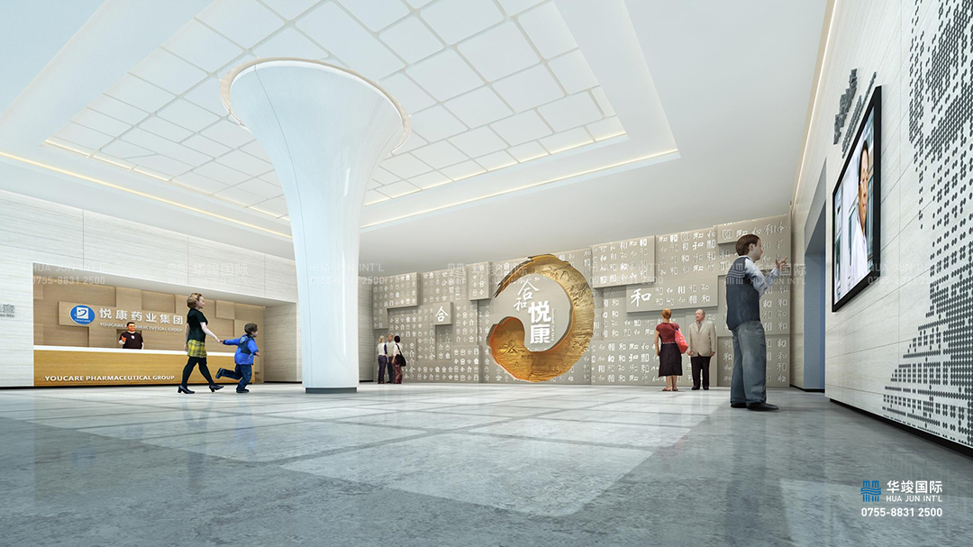 接待大廳,恢宏大氣,圍繞悅康“合和文化”,以人文、 健康,和諧的設計理念,營造出富有文化藝術氣息的空間氛圍。